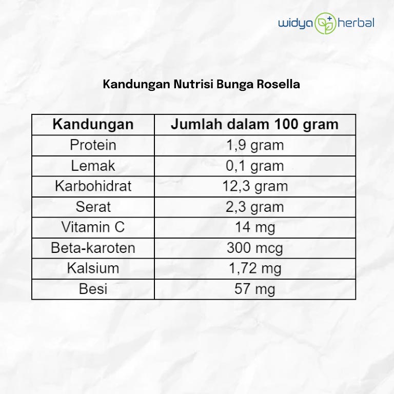 Di samping senyawa kimia yang beragam, bunga rosella juga mengandung berbagai nutrisi yang baik untuk kesehatan tubuh. Dalam 100 gram kelopak bunga rosella mengandung:
